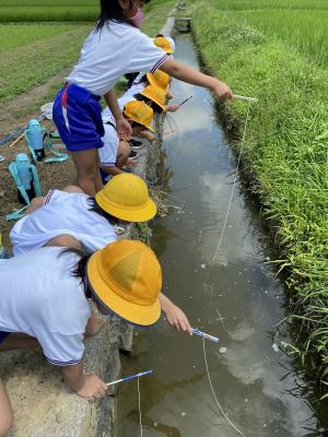 プールの後は生活科で、田んぼの水路に出かけザリガニ釣りをしました。エサは、「あたりめ」です。暑さも忘れ、子どもたちは黙々と釣っていました。たくさん釣れたと嬉しそうに学校に帰って来た1・2年生です。