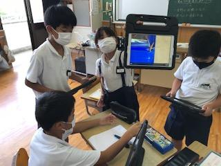4年生は理科で、暑い季節の生き物の学習です。自分たちが捕まえたバッタやカエルをタブレットで撮影したりしながら丁寧に観察していました。