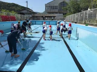 午後からは、プール清掃をしました。プールサイドは暑いくらいの良い天気でしたが、プールの中は気持ちがよく、短時間で見違えるほどきれいになりました。プールだけでなく、トイレや更衣室もぴかぴかになりました。4~6年生はよく働きました。御苦労様!