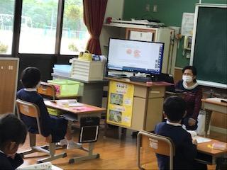 6年生が外国語の時間に、タブレットを使って日振島小学校の友達と英語でお互いの自己紹介をしていました。タブレットで、授業の可能性が広がりますね。